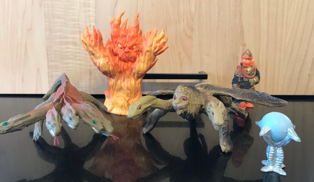 Weird monsters! The hydra and chimera are posable wire and rubber again while the fire elemental is a solid chunk of PVC. I should use it in my game next Sunday. I needed an astral dreadnought at GameholeCon in 2022, and it was a fun moment when I threw my ‘80s Jabba the Hutt figure down on the table as a stand-in. Standing in the back is a Sarke Mercenary. He should have a friend, but he apparently wandered off over the years.