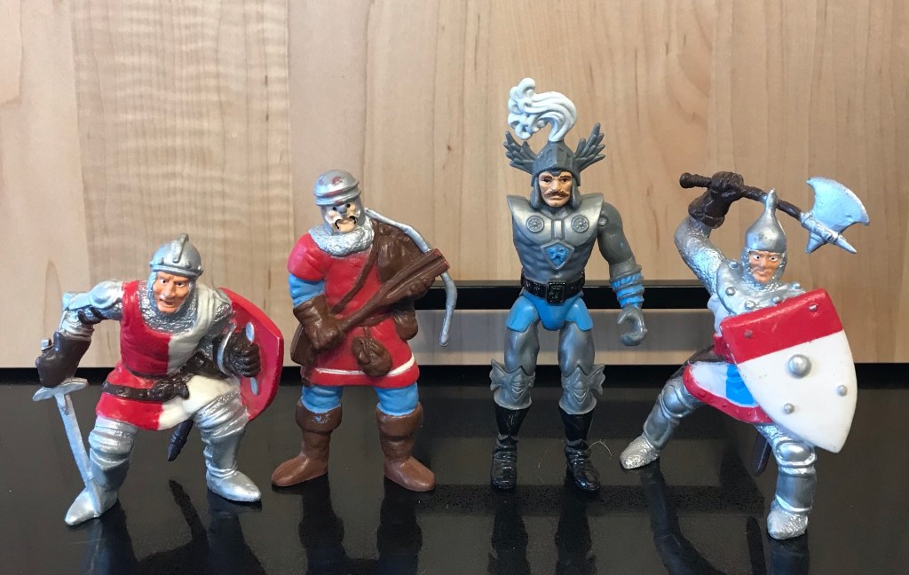 Here we have Warduke’s nemesis, Strongheart and his men-at-arms, seeing as how he’s missing an arm (and I’m apparently missing a man-at-arms, there should be two pairs). Strongheart had a sword and cape and a bronze dragon to ride (dragon sold separately), and was featured with Warduke on the cover of the toy tie-in adventure XL1 Quest for the Heartstone. Strongheart, Warduke, and the rest of their toy line also had stats in AC1 the Shady Dragon Inn. AC1 also had loads of BECMI pre-gens and was pretty useful if you needed some hirelings or a rival adventuring party.