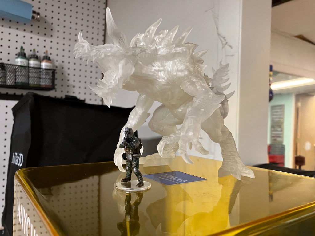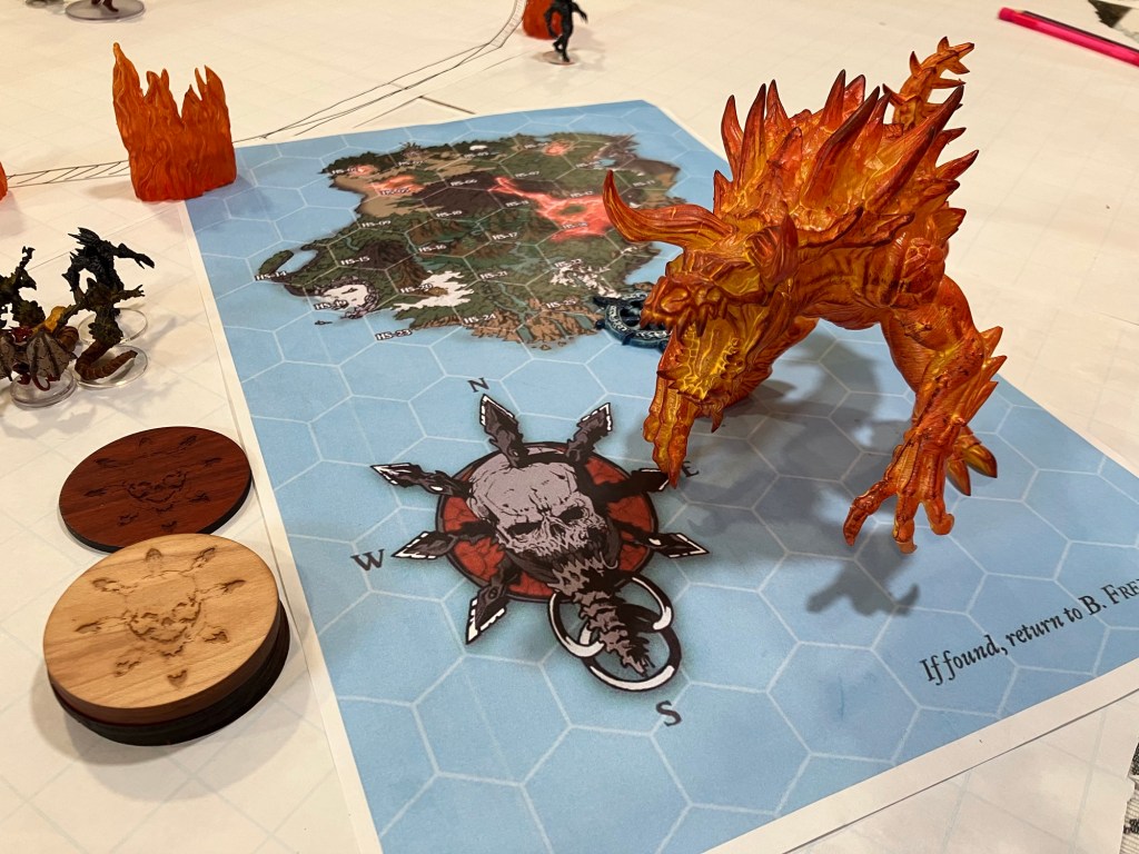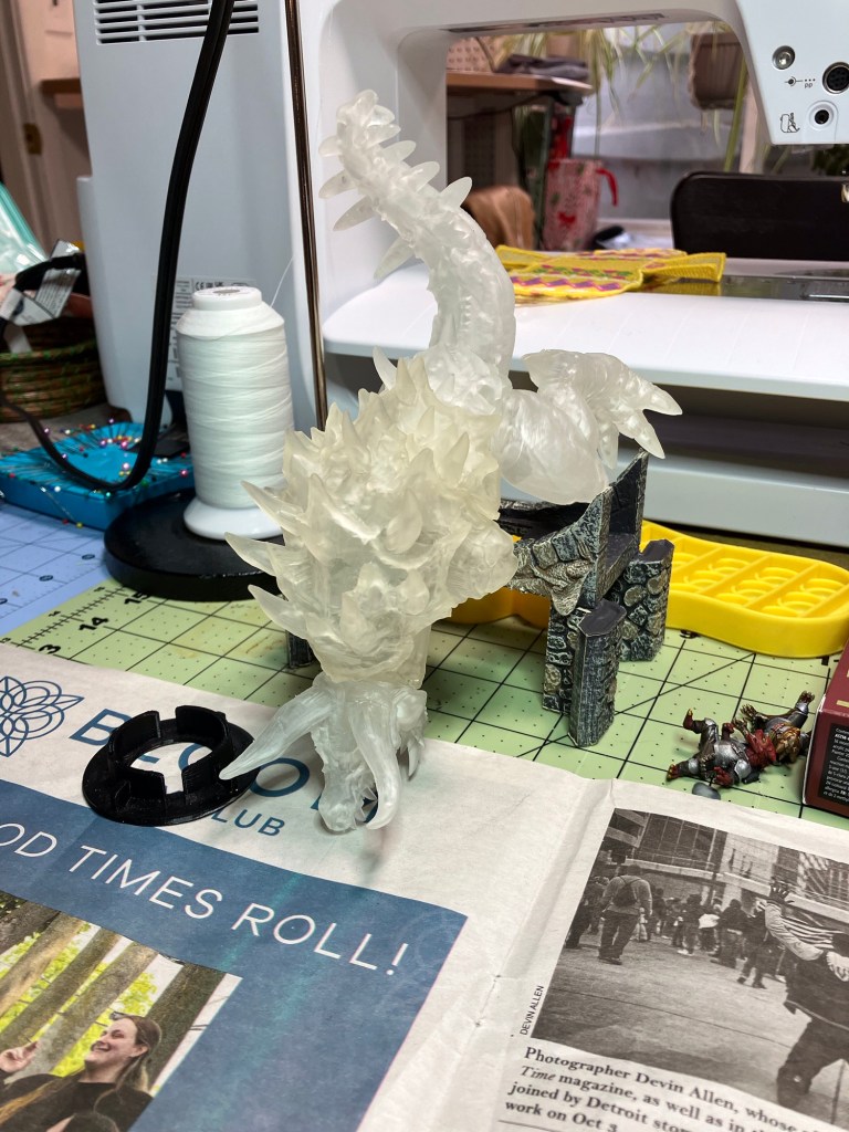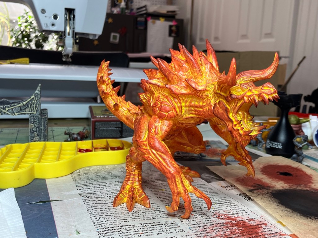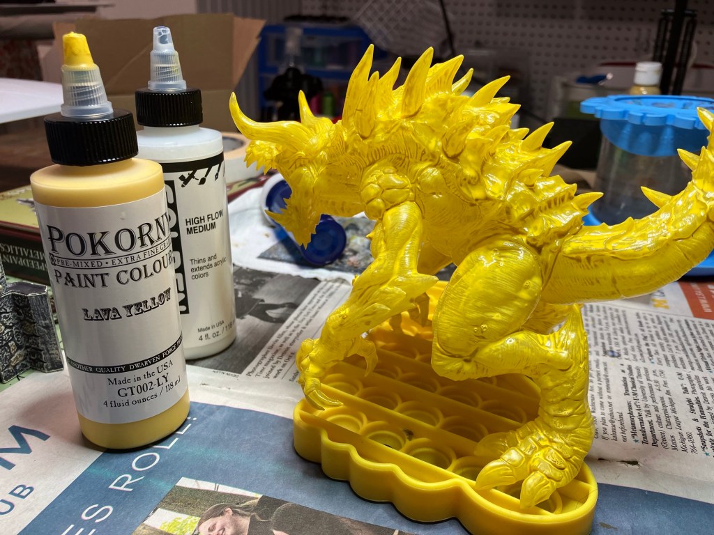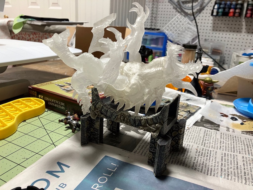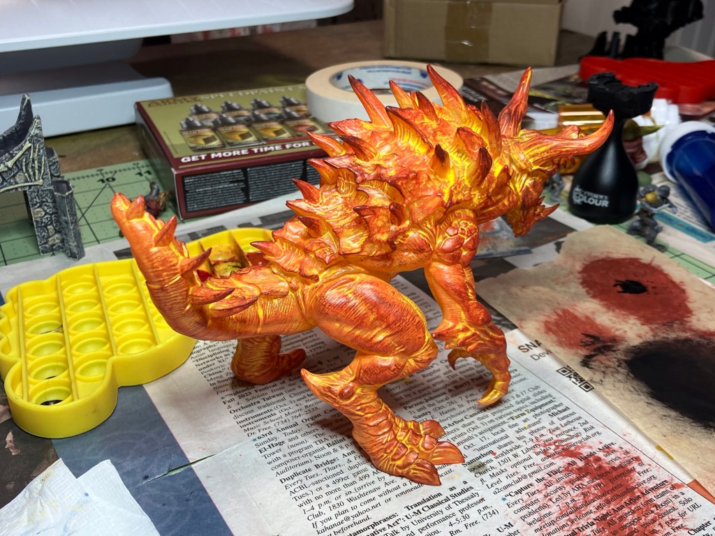 Molotek looks a bit like a triceratops in the art in the book, so I figured Artisan Guild’s tarrasque would fit the bill. It seems like sculpting a tarrasque is a rite of passage for anyone selling fantasy STLs, but I particularly liked the pose and texturing on this model. I scaled it down to 62.5% size and it’s still a big fellow. The full size model must be huge (like the WizKids model, or the Kenner rancor that I’ll use if I ever need a full size tarrasque). One happy advantage of scaling it down was that I could print the chest as one piece instead of four. Artisan Guild STLs come presupported (and the big ones are hollowed), and after some minor failures, I learned how to resize the holes and recalculate the supports. It was a neat process, but it still took a few days to print all twelve pieces. Then I glued them together and primed it with clear coat so that I could maintain as much transparency as possible. I used Pokorny Lava Yellow thinned with Golden High Flow Medium as a wash to get the yellow into all the nooks and crannies. Then I drybrushed Lava Orange, Deep Lava, and finally black, to build the flames in a reversal of the standard mini painting sequence (shadows in the crevices, lighter colors on the high points).