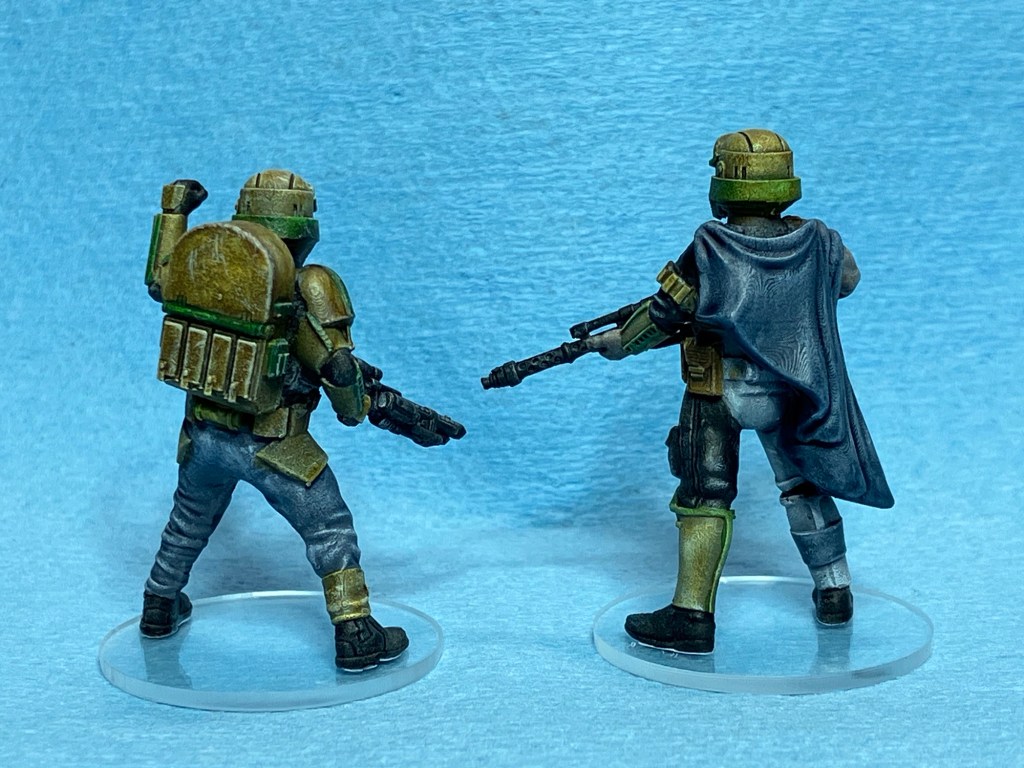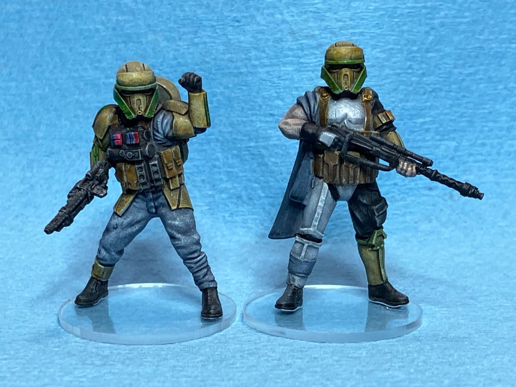 Minis! I painted up a couple of Skullforge’s shoretrooper “remnants.” I imagine these fellas were left behind by the collapse of the Empire and now eke out their existence as mercenaries wearing scavenged gear. My goal is to paint the entire squad in these colors for Stargrave. I’m really pleased with how they came out. I think the green looks good with the tan. I was tempted to try to hand paint a camouflage pattern on the one guy’s cape, but between his black pants and mismatched armor, it just seemed like it would be too busy. I think I made the right call. I’m tempted to add some shine to his white armor but I should probably leave it dingy. These guys are just gettin’ by as best they can.