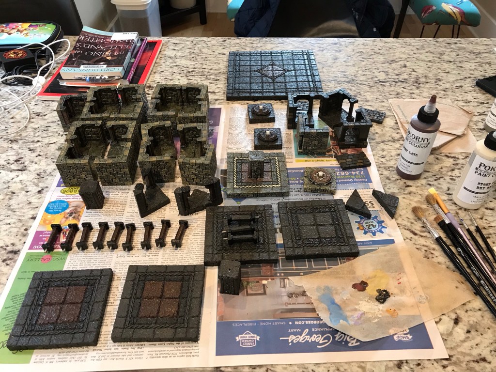 But what does this have to do with minis? When I paint, I often get restless after ten or fifteen minutes. I want to check my phone, or have a snack, or run off and do anything else. But if I can take a breath and push through that feeling, I enter a wonderful state of presence that is all too rare these days. I’m house-sitting this week and I brought my unpainted Dwarven Forge dungeon pieces to work on while I’m here. After doing the first coat of lava red on a few pieces, I definitely wanted to run off and read or play Breath of the Wild or do anything else. But once I got through that initial discomfort, it felt really good, and I could paint for a long time. And after that, I’d gotten a lot done!