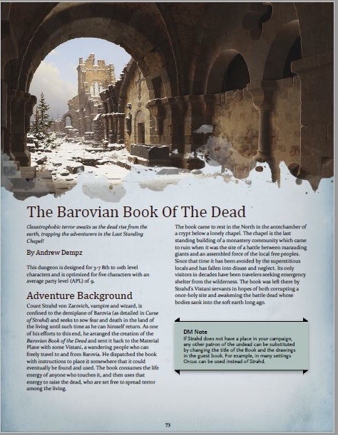 What I Actually Wrote: “The Barovian Book of the Dead” is an enjoyable, quick read. I would change a few things, like trimming down the introductory boxed text, presenting descriptive text more efficiently, and dialing back the level range (8th level characters are going to tear through skeletons), but it’s structurally sound and would be a nice diversion. Christian drew the maps in addition to doing project management and layout and they look great. There’s a quirk on mine, the windows of the chapel are numbered one through ten because I made a tracker sheet for the DM to use during the siege, but it was accidentally not included with the adventure. No big deal, really. All in all, I’m pretty happy with this. Nicely done, Andy of Adventures Past.