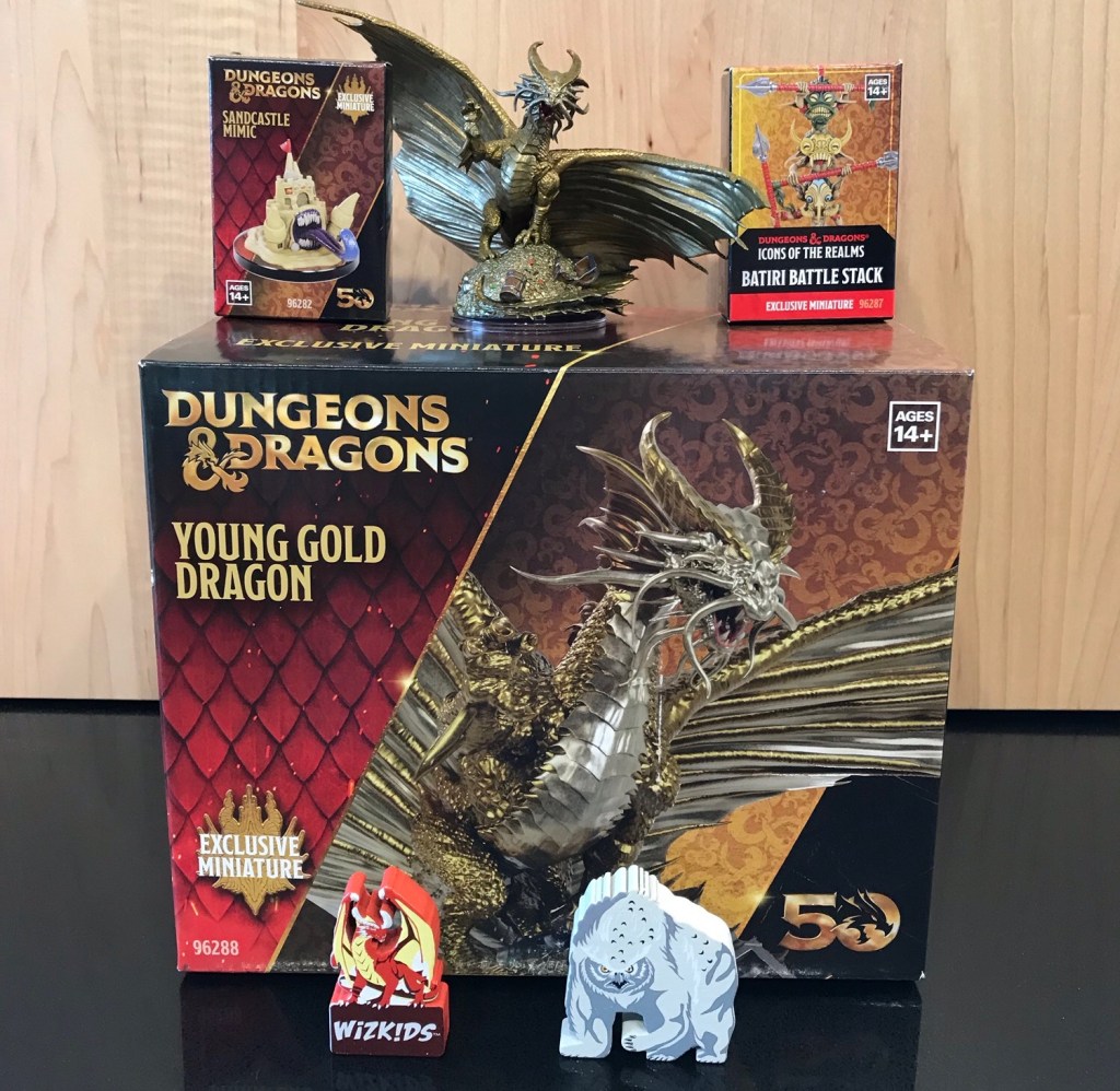 I got a few of the exclusive WizKids minis, but not the ones you needed a ticket for. Speaking of, I didn’t get the 2024 D&D Players Handbook either. I usually woke up after the tickets became available, so it wasn’t meant to be, and the promised gold foil stamp to mark the event turned out to just be a loose sticker anyway. This is a lovely dragon, though. And I got two of the new D&D meeples for my kids. Odd products, but good little gifts.