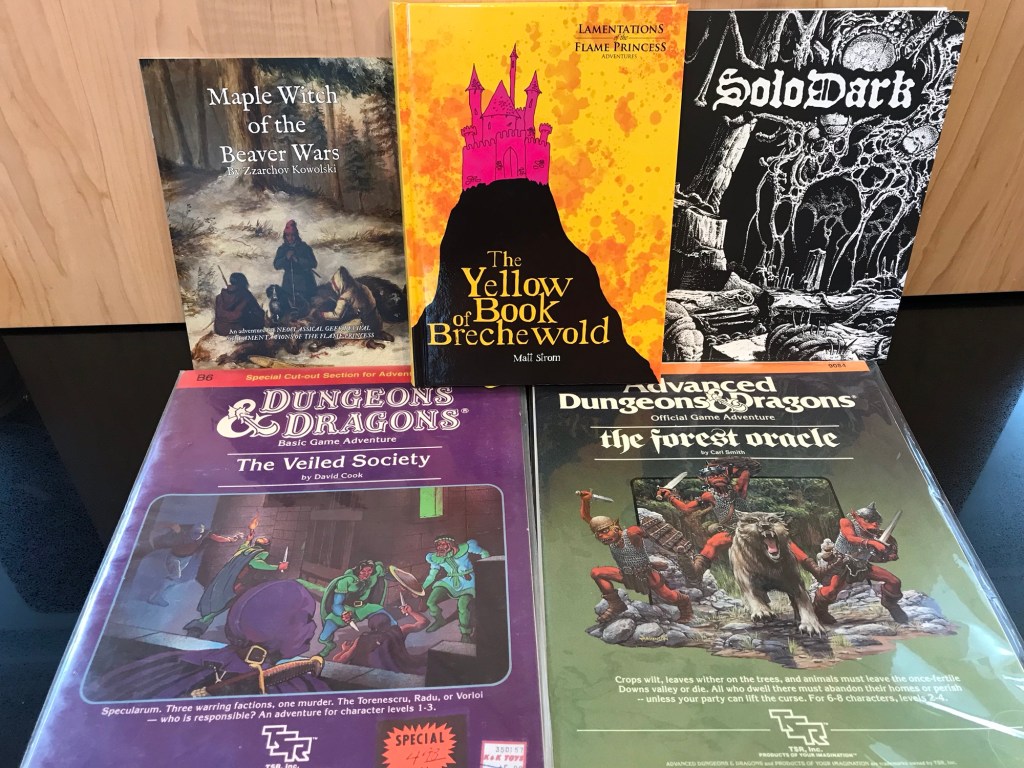 The Yellow Book of Brechewold comes well-reviewed, and is an Arthurian magic school hybrid, or something of the sort? And it has an odd home at Lamentations of the Flame Princess as it doesn’t seek to test the sensibilities of its readers. There was a line at the Shadowdark booth during the day after they cleaned up with four Ennies. I went in on the Kickstarter so the only new thing for me was the Solodark pamphlet. It’s really more of a reference to some blogs and videos with a couple of pages of its own rules. I’ll have to watch the YouTube video to see how it really goes, because while this provides some jumping off points for figuring it out yourself, it’s really loose and I’m not sure I could play solo from it without doing my own additional reasearch. But I guess that’s the point? I’d prefer a complete system, but oh well. Maple Witch of the Beaver Wars is a Neoclassical Geek Revival module, and how can you pass up that title? Quite Canadian.