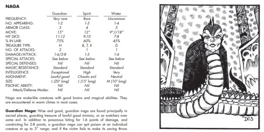There’s another tricky bit with the spirit naga stat block. In AD&D, the naga’s charm was virtually permanent. In the 2014 Monster Manual, this had been walked back to casting dominate person once or twice a day. This is gone completely in the 2025 book. The spirit naga has a handful of utility and offensive spells, but it’s lost its mind control entirely!